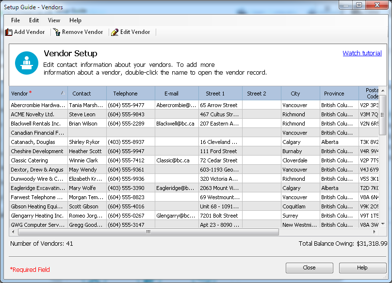You can enter vendors and opening balances in the Vendor Ledger or in the Setup Guide. To learn more, watch the Vendor Setup video tutorial in the Learning Centre, or search for Add or modify a vendor and Setup Guide.