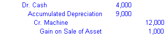The service life and residual value of a long-lived asset are estimates because no one knows how long the asset will provide service. Thus, when you sell or dispose of an asset, the amount realized, if any, is likely to differ from its net book value. If the amount realized is more than the book value, there is a gain, and if less, there is a loss. The entry removes both the asset's cost and its accumulated depreciation. For example, if a machine was sold for $4,000 cash at the end of the 90th month and its cost was $12,000, its accumulated depreciation is $9,000, so its net book value is $3,000. The following entry records the receipt of cash, the gain, and the removal of the asset and its accumulated depreciation from the books:
