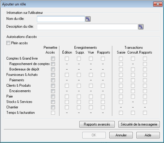 Donnez un nom et une description au rôle, puis sélectionnez les droits d'accès. Cliquez sur Rapports avancés pour limiter l'accès à des rapports d'opérations bancaires et d'entreprise spécifiques.