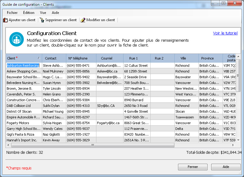 Vous pouvez saisir des clients et des soldes d’ouverture dans le Module des clients ou dans le Guide de configuration. Pour en savoir plus, regardez le tutoriel vidéo Configuration de client dans le Centre d’apprentissage,ou cherchez Ajouter ou modifier un client et le Guide de configuration.