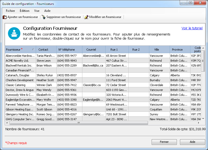 Vous pouvez entrer des fournisseurs et soldes d’ouverture dans le Module des fournisseurs ou dans le Guide de configuration. Pour en savoir plus, regardez le tutoriel vidéo Configuration de fournisseur dans le Centre d’apprentissage,ou cherchez Ajouter ou modifier un fournisseur et le Guide de configuration.