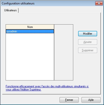 Pour configurer des utilisateurs additionnels, vous devez d'abord créer un mot de passe pour l'administrateur de Sage 50 Comptabilité, sysadmin. Cliquez sur Modifier, puis entrez un mot de passe. Votre mot de passe doit être « sécurisé », c’est-à-dire contenir une combinaison de 5 à 7 chiffres et de lettres, difficile à deviner. Pour en savoir plus, recherchez En savoir plus sur la sécurité et les droits d’accès.
